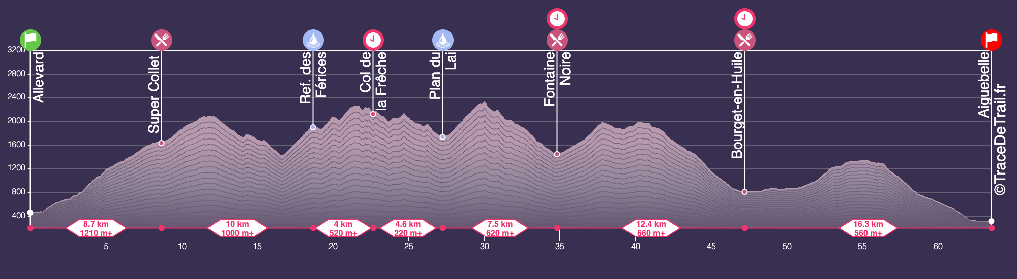 Un concentré de Belledonne pour ce tracé extrême ! Cette skyrace® propose une montée par les lacs des 7 Laux par le chemin nord, un passage au lac blanc, puis au col de l’amiante jusqu’au Rocher blanc (2928m). Descente par le vallon de la Combe madame jusqu’à Fond-de-France.